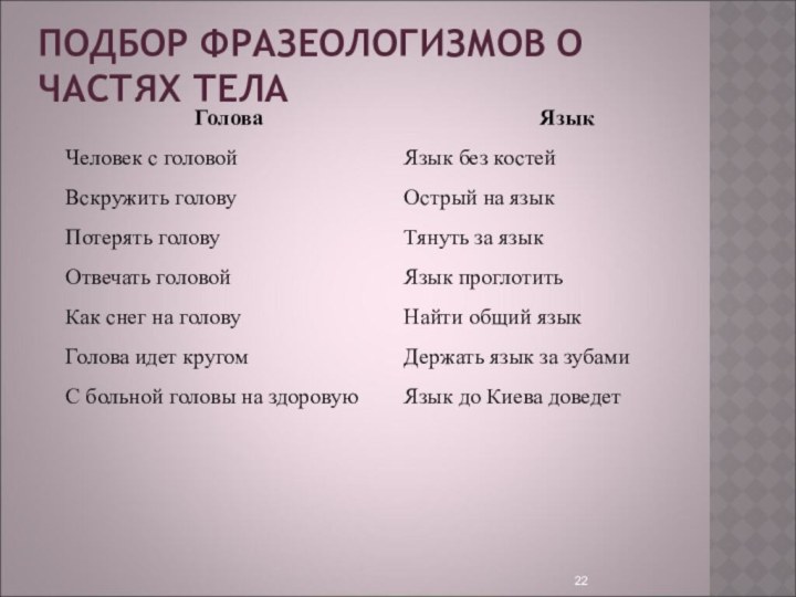 ПОДБОР ФРАЗЕОЛОГИЗМОВ О ЧАСТЯХ ТЕЛА