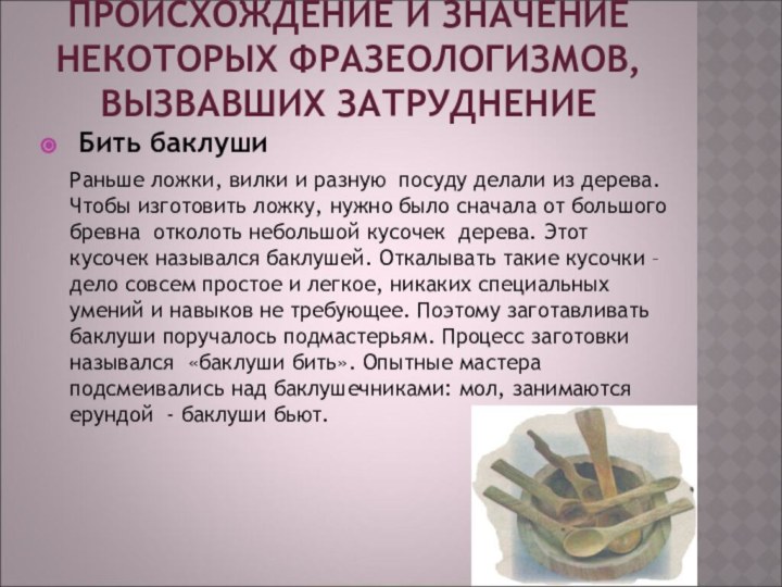 делали из дерева. Чтобы изготовить ложку, нужно было сначала от большого бревна отколоть небольшой кусочек дерева. Этот кусочек назывался баклушей. Откалывать такие кусочки – дело совсем простое и легкое, никаких специальных умений и навыков не требующее. Поэтому заготавливать баклуши поручалось подмастерьям. Процесс заготовки назывался «баклуши бить». Опытные мастера подсмеивались над баклушечниками: мол, занимаются ерундой - баклуши бьют.