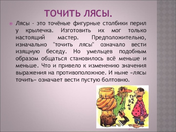 изначально "точить лясы" означало вести изящную беседу. Но умельцев подобным образом общаться становилось всё меньше и меньше. Что и привело к изменению значения выражения на противоположное. И ныне «лясы точить» означает вести пустую болтовню.