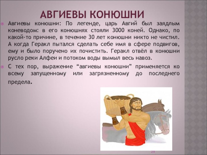 по какой-то причине, в течение 30 лет конюшни никто не чистил. А когда Геракл пытался сделать себе имя в сфере подвигов, ему и было поручено их почистить. Геракл отвёл в конюшни русло реки Алфеи и потоком воды вымыл весь навоз.