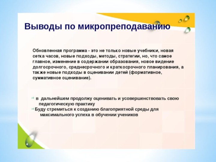 Микропреподавание позволило выйти на новый уровень преподавания: применение новых знаний в планировании и проведении занятий по развитию четырёх языковых навыков: слушания, говорения, чтения и письма, формативного и суммативного оценивания для достижения целей обучения.