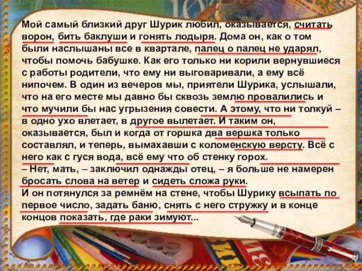 о том были наслышаны все в квартале, палец о палец не ударял, чтобы помочь бабушке. Как его только ни корили вернувшиеся с работы родители, что ему ни выговаривали, а ему всё нипочем. В один из вечеров мы, приятели Шурика, услышали, что на его месте мы давно бы сквозь землю провалились и что мучили бы нас угрызения совести. А этому, что ни толкуй – в одно ухо влетает, в другое вылетает. И таким он, оказывается, был и когда от горшка два вершка только составлял, и теперь, вымахавши с коломенскую версту. Всё с него как с гуся вода, всё ему что об стенку горох.