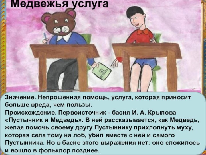 «Пустынник и Медведь». В ней рассказывается, как Медведь, желая помочь своему другу Пустыннику прихлопнуть муху, которая села тому на лоб, убил вместе с ней и самого Пустынника. Но в басне этого выражения нет: оно сложилось и вошло в фольклор позднее.
