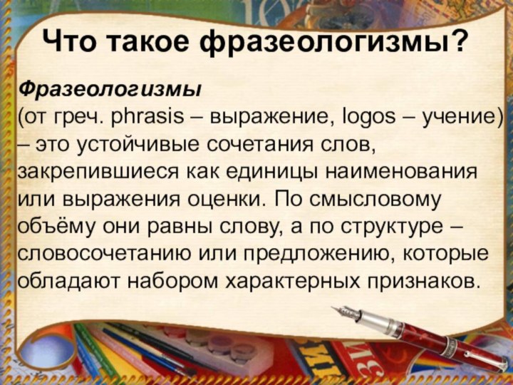 закрепившиеся как единицы наименования или выражения оценки. По смысловому объёму они равны слову, а по структуре – словосочетанию или предложению, которые обладают набором характерных признаков.