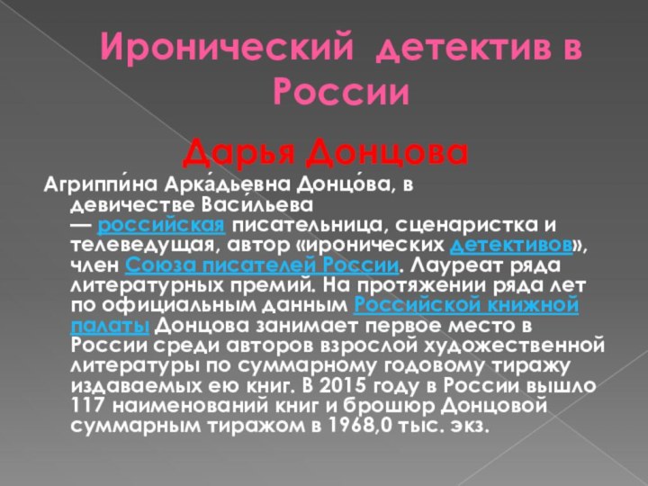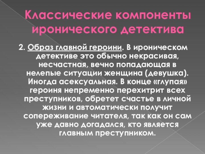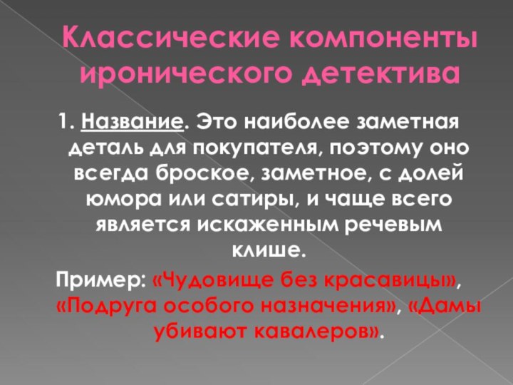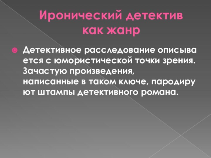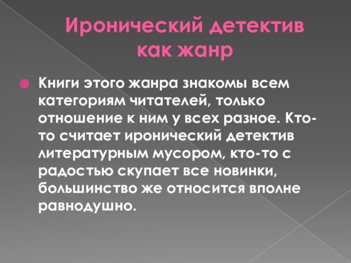 Иронический детектив как жанрКниги этого жанра знакомы всем категориям читателей, только отношение к ним у всех разное. Кто-то считает иронический детектив литературным мусором, кто-то с радостью скупает все новинки, большинство же относится вполне равнодушно.