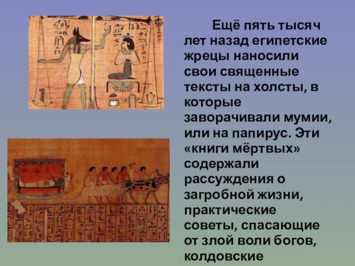 холсты, в которые заворачивали мумии, или на папирус. Эти «книги мёртвых» содержали рассуждения о загробной жизни, практические советы, спасающие от злой воли богов, колдовские формулы.