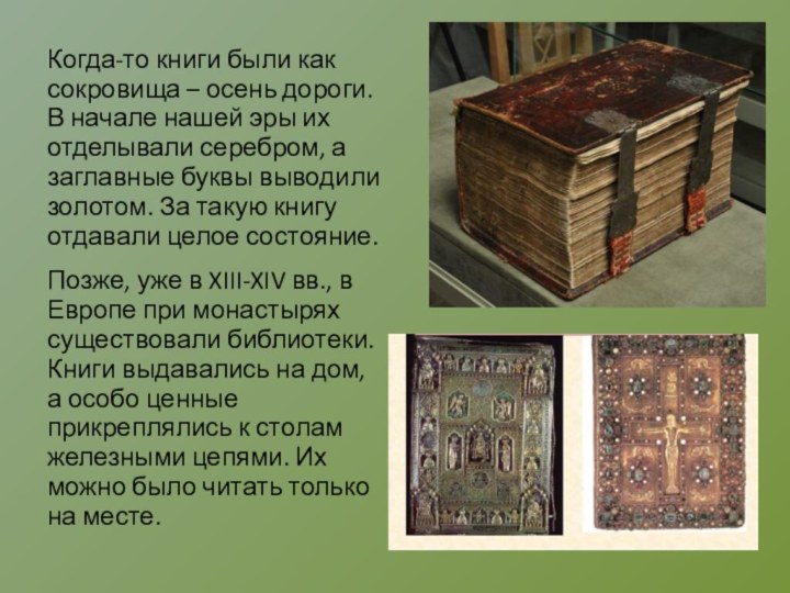 Позже, уже в XIII-XIV вв., в Европе при монастырях существовали библиотеки. Книги выдавались на дом, а особо ценные прикреплялись к столам железными цепями. Их можно было читать только на месте.