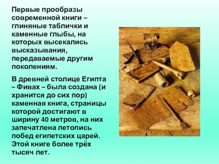 древней столице Египта – Фивах – была создана (и хранится до сих пор) каменная книга, страницы которой достигают в ширину 40 метров, на них запечатлена летопись побед египетских царей. Этой книге более трёх тысяч лет.