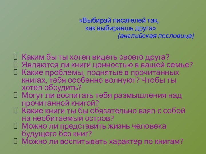 Какие проблемы, поднятые в прочитанных книгах, тебя особенно волнуют? Чтобы ты хотел обсудить?