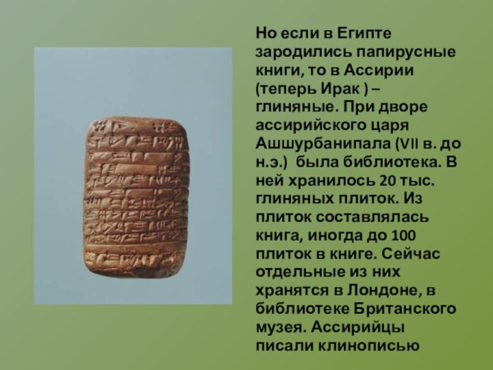 ассирийского царя Ашшурбанипала (VII в. до н.э.) была библиотека. В ней хранилось 20 тыс. глиняных плиток. Из плиток составлялась книга, иногда до 100 плиток в книге. Сейчас отдельные из них хранятся в Лондоне, в библиотеке Британского музея. Ассирийцы писали клинописью