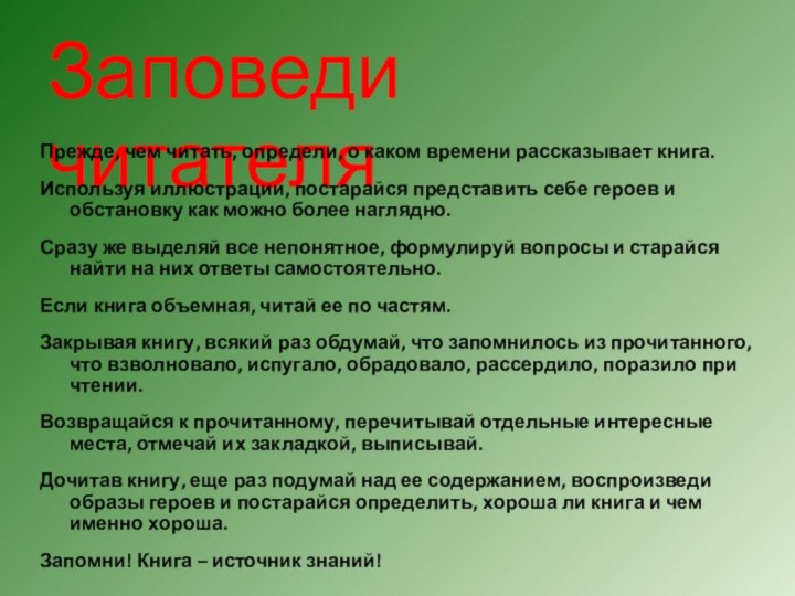 Закрывая книгу, всякий раз обдумай, что запомнилось из прочитанного, что взволновало, испугало, обрадовало, рассердило, поразило при чтении.