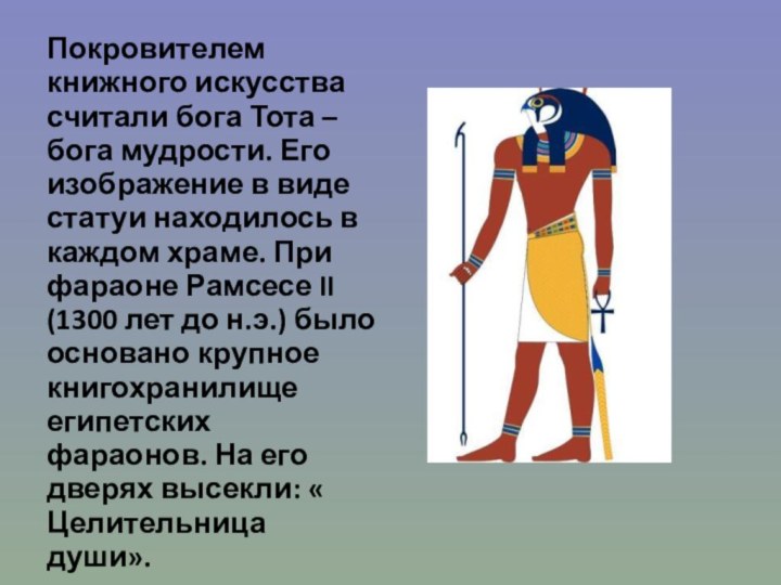 храме. При фараоне Рамсесе II (1300 лет до н.э.) было основано крупное книгохранилище египетских фараонов. На его дверях высекли: « Целительница души».