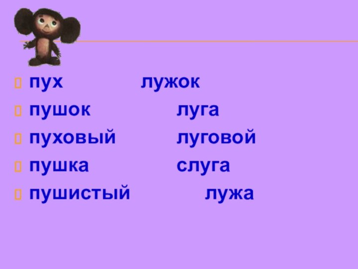 пух 			 		лужокпушок 		  		луга 	пуховый 		 		луговойпушка