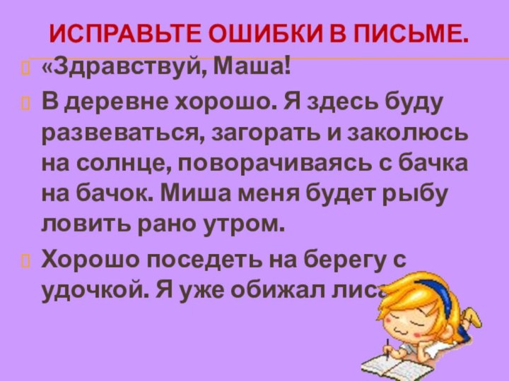 ИСПРАВЬТЕ ОШИБКИ В ПИСЬМЕ. «Здравствуй, Маша!В деревне хорошо. Я здесь буду