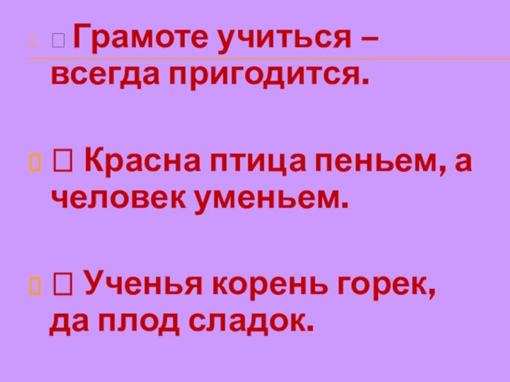 Ÿ Грамоте учиться – всегда пригодится.Ÿ Красна птица пеньем, а человек уменьем.Ÿ ЛИДТЕУВЭА пух 			 		лужокпушок 		    		луга 	пуховый 		 		луговойпушка В КАКОЙ ЧАСТИ СЛОВА НАХОДЯТСЯ ВЫДЕЛЕННЫЕ ОРФОГРАММЫИскать, ловкий, доблестный, тропинка, известность, ошибка, ночной, секрет, хлестнуть. КАКАЯ ГЛАСНАЯ ПРОПУЩЕНА?Напиши слова в строчку через запятую.А КАКАЯ ГЛАСНАЯ ПРОПУЩЕНА?Напиши слова в строчку через запятую.О КАКАЯ ГЛАСНАЯ ПРОПУЩЕНА?Напиши слова в строчку через запятую.А ИСПРАВЬТЕ ОШИБКИ В ПИСЬМЕ. «Здравствуй, Маша!В деревне хорошо. Я здесь буду развеваться, СПАСИБО ЗА УРОК!Молодцы!