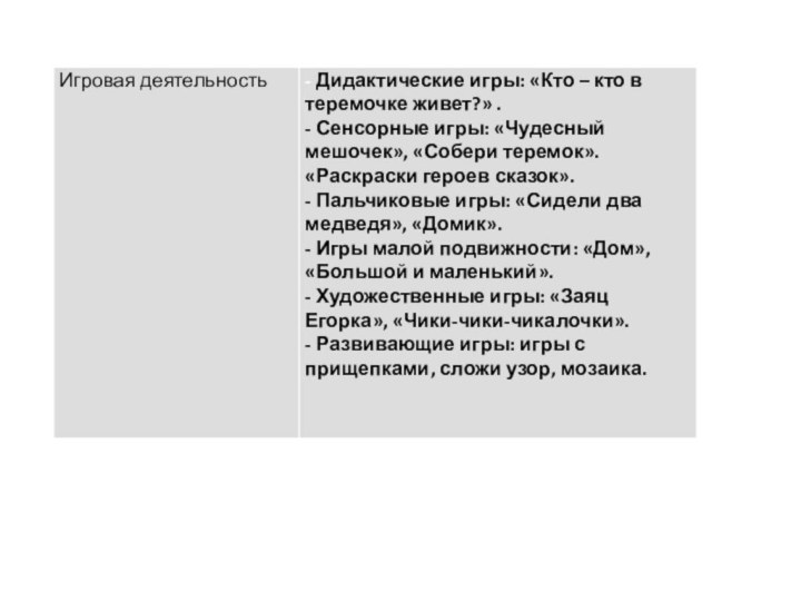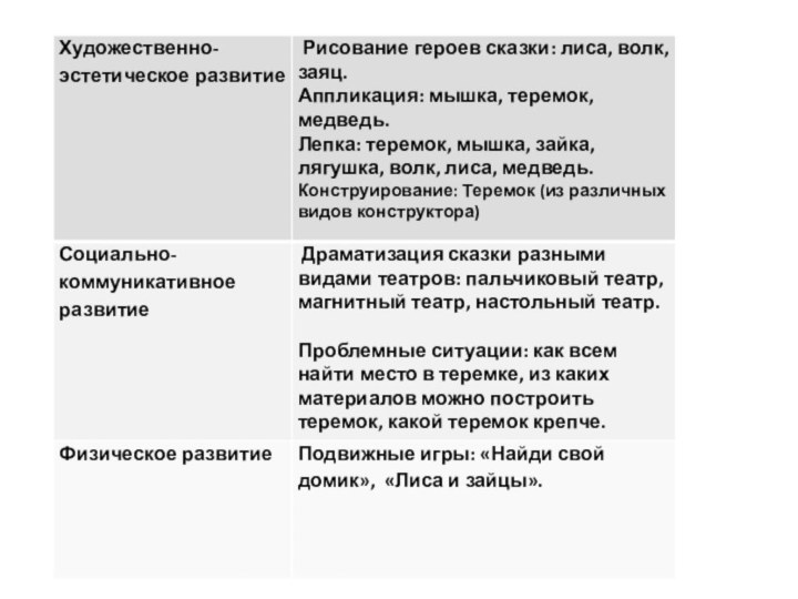 методическим материалом, литературой по данной теме. 2 этап – организация деятельности совместная и непосредственно образовательная деятельность с детьми организация работы с родителями акция «Подарите книгу детскому саду» 3 этап - отчетность открытое занятие для родителей инсценировка сказки «Теремок» изготовление героев сказок для кукольного театра.