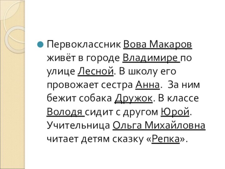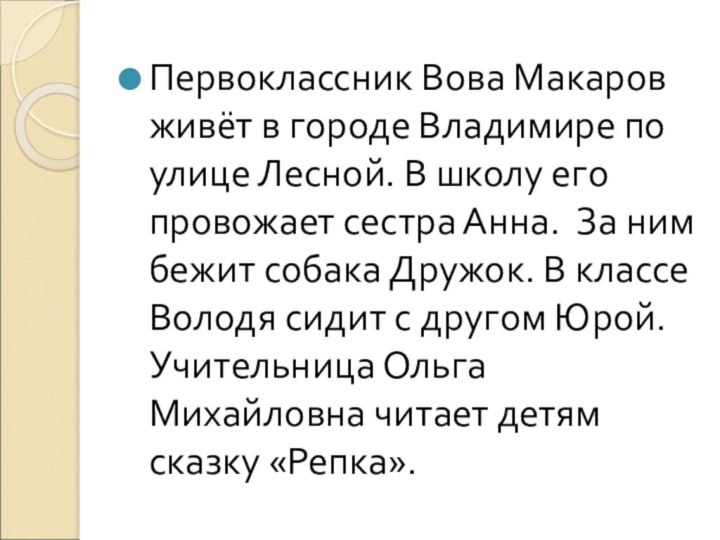 ним бежит собака Дружок. В классе Володя сидит с другом Юрой. Учительница Ольга Михайловна читает детям сказку «Репка».