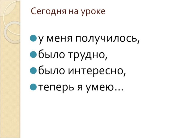 Сегодня на уроке у меня получилось, было трудно, было интересно, теперь я умею…