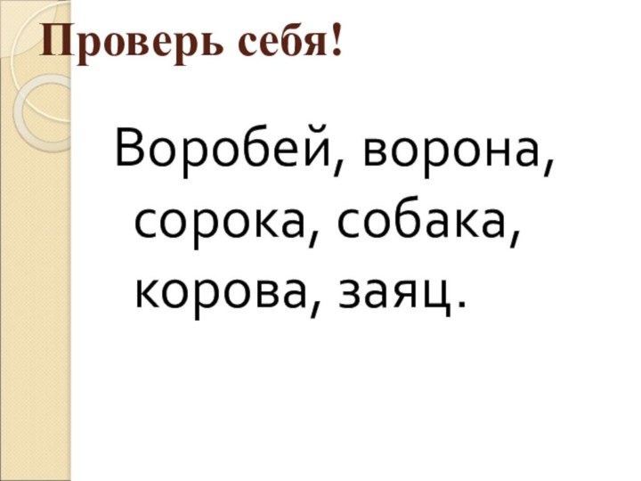 Проверь себя! Воробей, ворона, сорока, собака, корова, заяц.