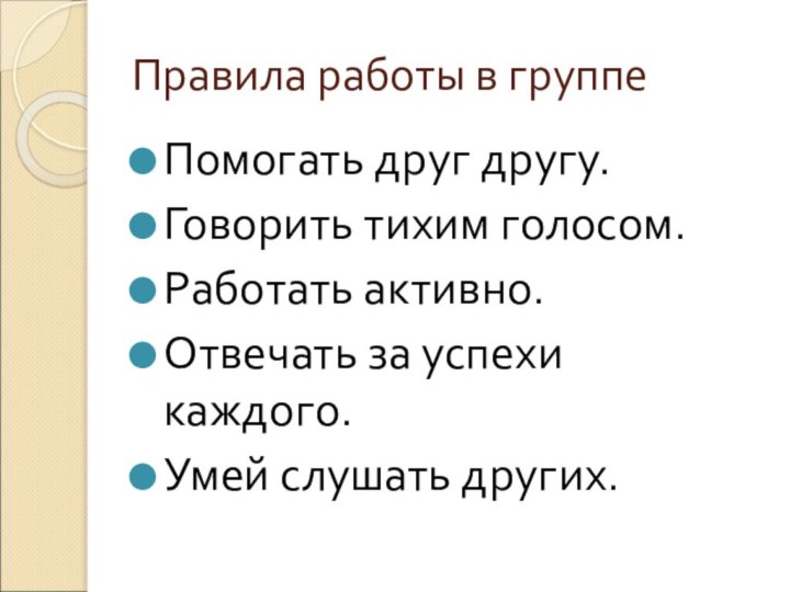 Правила работы в группеПомогать друг другу.Говорить тихим голосом.Работать активно.Отвечать за успехи каждого.Умей слушать других.