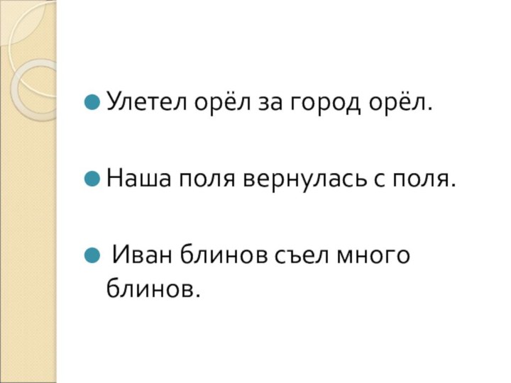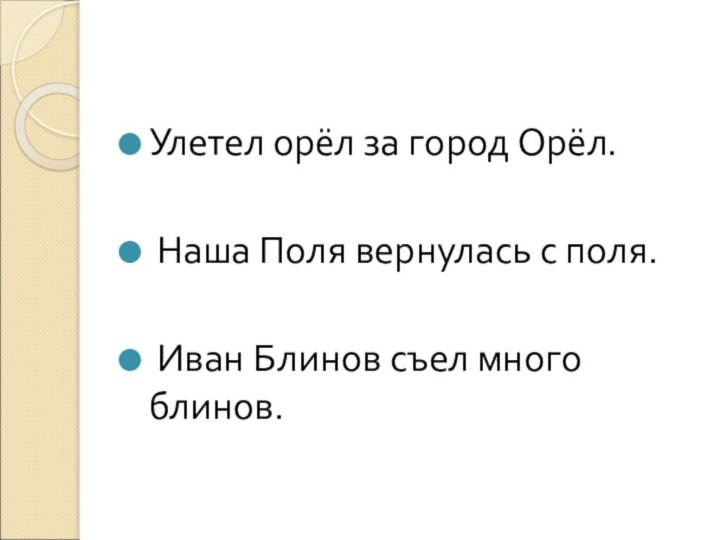 Улетел орёл за город Орёл. Наша Поля вернулась с поля. Иван Блинов съел много блинов.