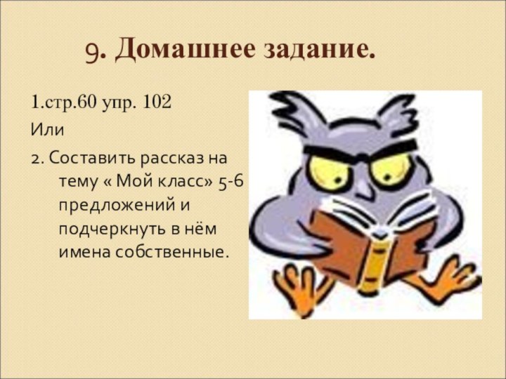 Русский язык Проверь себя! Воробей, ворона, сорока, собака, корова, заяц. кошка     Мурка собака     Жучка Ребята, давайте жить дружно!5. Физкультминутка. Петя, утро, Шарик, город, шарик, Иванович, Кузнецов, ученик. Петя собственные  нарицательныеПетя Улетел орёл за город орёл. Наша поля вернулась с поля. Иван блинов съел много блинов. Улетел орёл за город Орёл. Наша Поля вернулась с поля. Иван Блинов съел много блинов. Правила работы в группеПомогать друг другу.Говорить тихим голосом.Работать активно.Отвечать за успехи каждого.Умей слушать других. Первоклассник Вова Макаров живёт в городе Владимире по улице Лесной. В школу Первоклассник Вова Макаров живёт в городе Владимире по улице Лесной. В школу Бажов Волков Драгунский Носов Олеша Успенский тест Сегодня на уроке  у меня получилось, было трудно, было интересно, теперь я умею… 9. Домашнее задание.1.стр.60 упр. 102Или 2. Составить рассказ на тему « Мой
