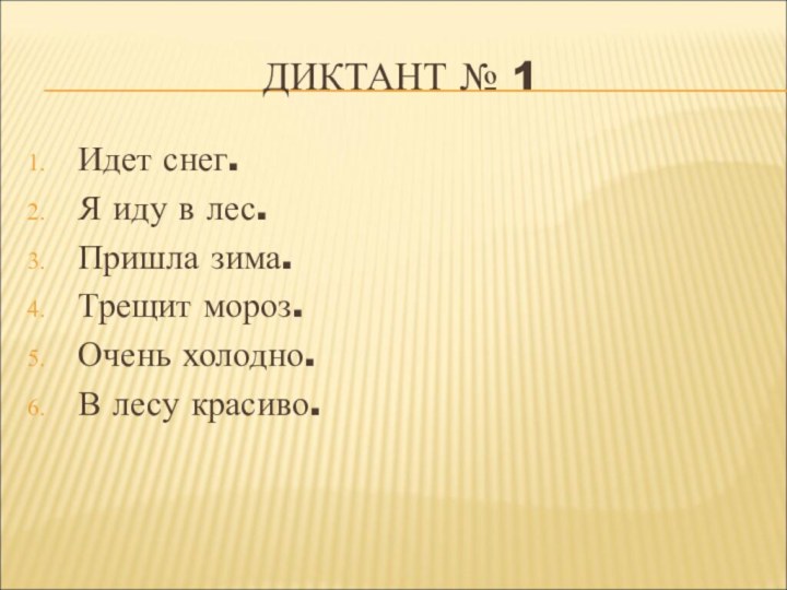 ДИКТАНТ № 1Идет снег.Я иду в лес.Пришла зима.Трещит мороз.Очень холодно.В лесу красиво.