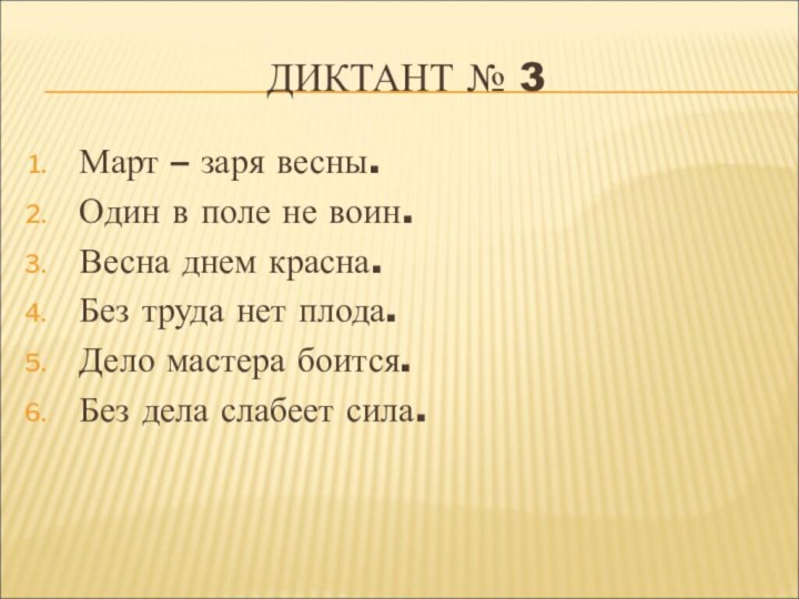 ДИКТАНТ № 3Март – заря весны.Один в поле не воин.Весна днем