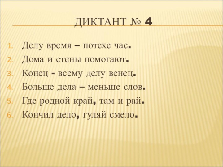 ДИКТАНТ № 4Делу время – потехе час.Дома и стены помогают.Конец -