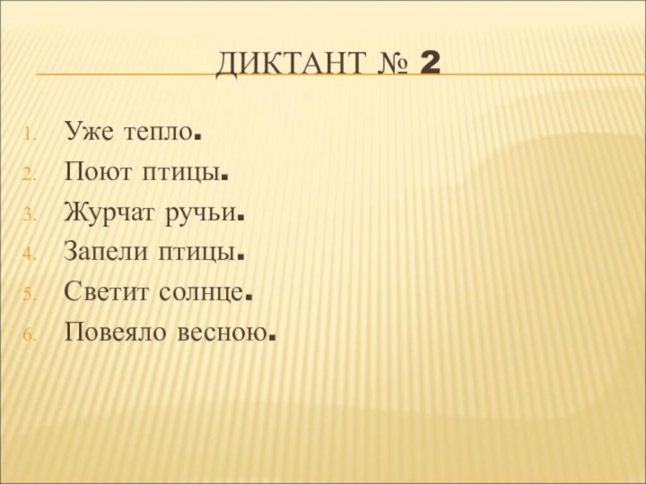 ДИКТАНТ № 2Уже тепло.Поют птицы.Журчат ручьи.Запели птицы.Светит солнце.Повеяло весною.