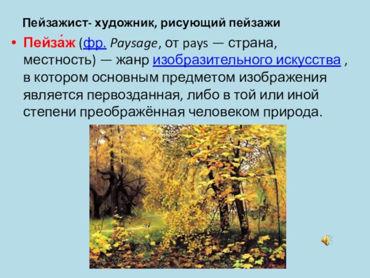 Пейзажист- художник, рисующий пейзажи Пейза́ж (фр. Paysage, от pays — страна, местность) — жанр изобразительного искусства ,