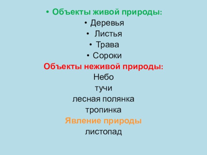 Объекты живой природы:Деревья ЛистьяТраваСорокиОбъекты неживой природы:Неботучилесная полянкатропинкаЯвление природылистопад