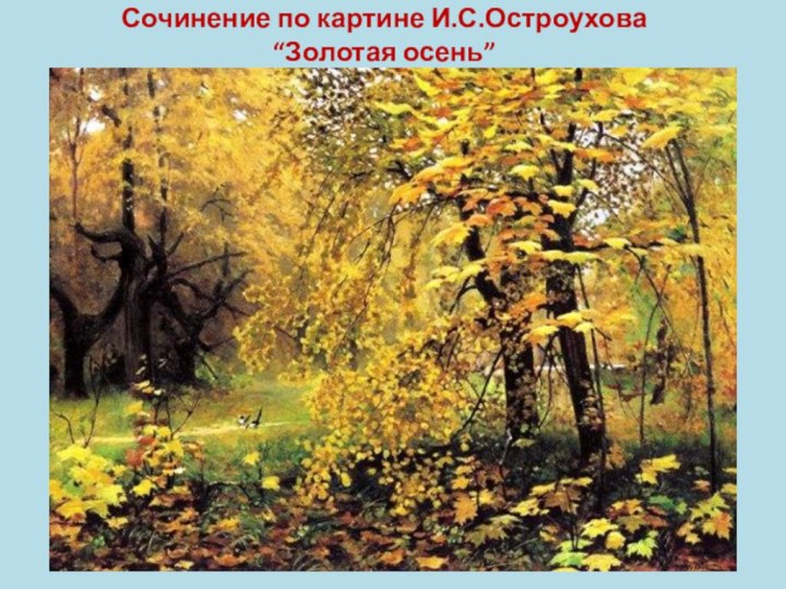 Сочинение по картине И.С.Остроухова “Золотая осень”Сочинение- это1.Создание литературного, художественного, научного, музыкального произведения.2. Сочинение по картине И.С.Остроухова “Золотая осень”Русский художник, пейзажист Илья Семёнович Остроухов1858—1929 Пейзажист- художник, рисующий пейзажи  Пейза́ж (фр. Paysage, от pays — страна, местность) — жанр изобразительного искусства , Сочинение по картине И.С.Остроухова  “Золотая осень” Какие объекты и явления природы изобразил на своей картине художник? Объекты живой природы:Деревья ЛистьяТраваСорокиОбъекты неживой природы:Неботучилесная полянкатропинкаЯвление природылистопад Опорные слова: ярко- жёлтые, золотые, оранжевые листья, лесная полянка, яркие краски, красивый