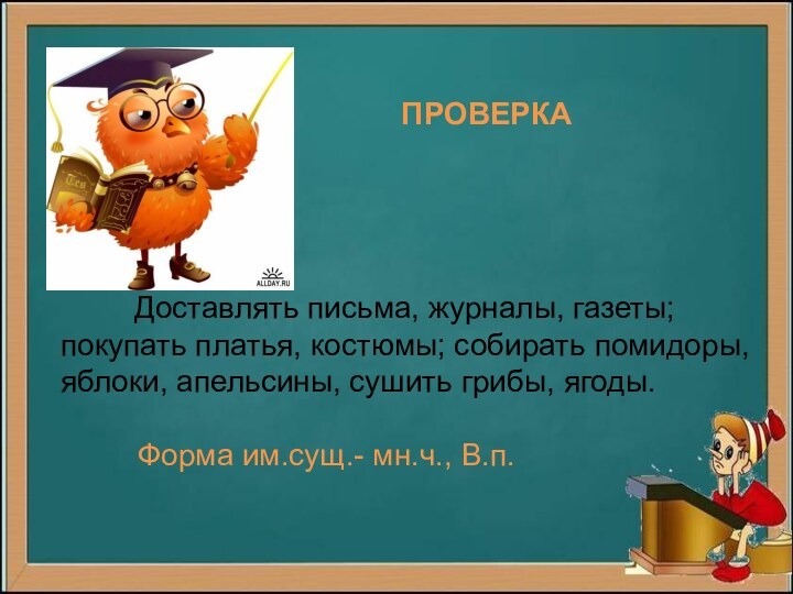 Доставлять письма, журналы, газеты; покупать платья, костюмы; собирать помидоры, яблоки, апельсины, сушить грибы, ягоды.