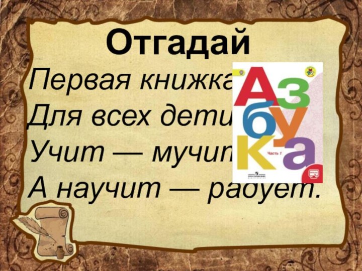 ОтгадайПервая книжка  Для всех детишек:  Учит — мучит,  А научит — радует.