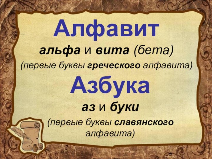 Алфавитальфа и вита (бета)(первые буквы греческого алфавита)Азбукааз и буки(первые буквы славянского алфавита)