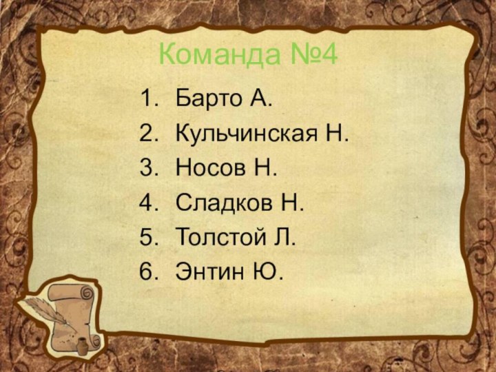 Команда №4Барто А.Кульчинская Н.Носов Н.Сладков Н.Толстой Л.Энтин Ю.