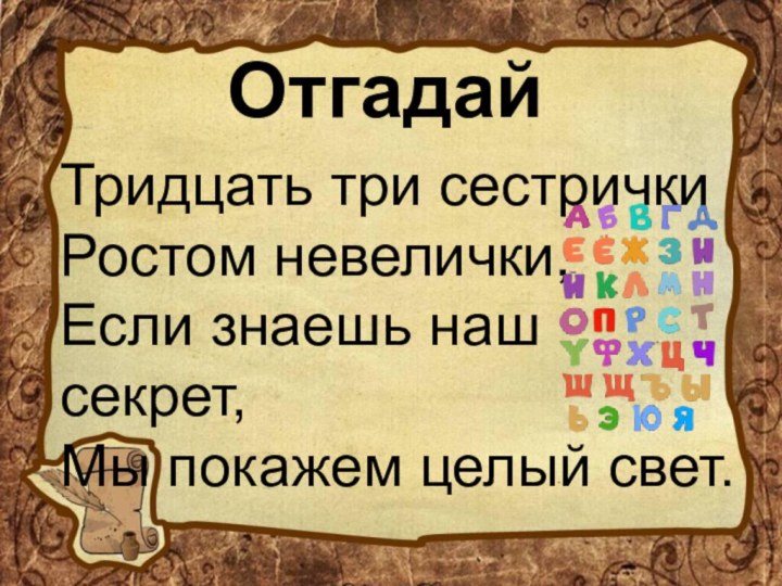 ОтгадайТридцать три сестрички Ростом невелички, Если знаешь наш секрет, Мы покажем целый свет.