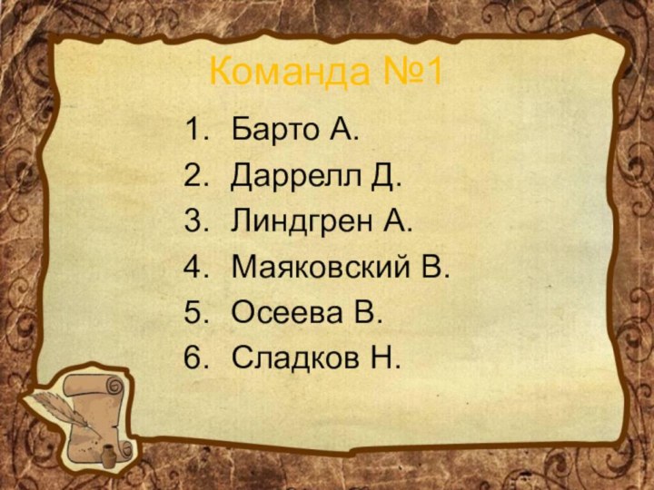 Команда №1Барто А.Даррелл Д.Линдгрен А.Маяковский В.Осеева В.Сладков Н.