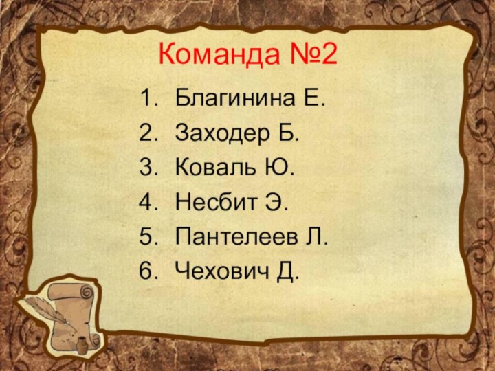 Команда №2Благинина Е.Заходер Б.Коваль Ю.Несбит Э.Пантелеев Л.Чехович Д.