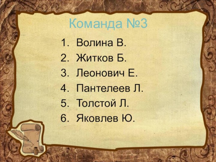 Команда №3Волина В.Житков Б.Леонович Е.Пантелеев Л.Толстой Л.Яковлев Ю.
