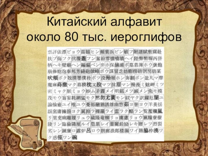 Слайд 12 Китайский алфавит около 80 тыс. иероглифов