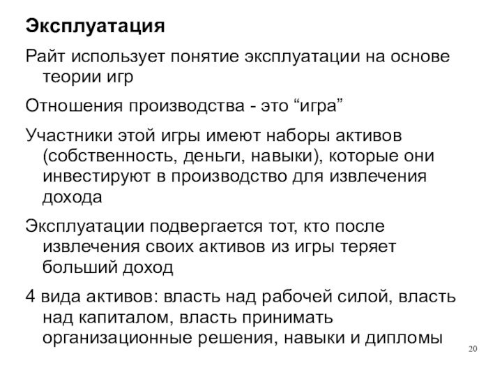 4 вида активов: власть над рабочей силой, власть над капиталом, власть принимать организационные решения, навыки и дипломы