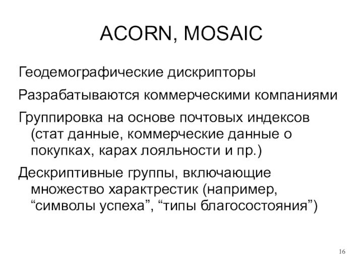 Дескриптивные группы, включающие множество характрестик (например, “символы успеха”, “типы благосостояния”)