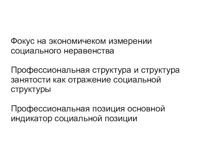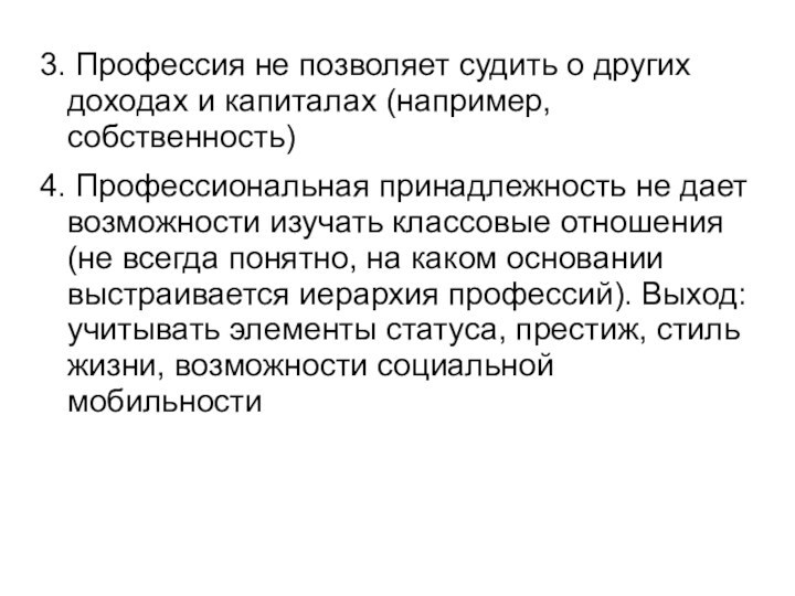 изучать классовые отношения (не всегда понятно, на каком основании выстраивается иерархия профессий). Выход: учитывать элементы статуса, престиж, стиль жизни, возможности социальной мобильности