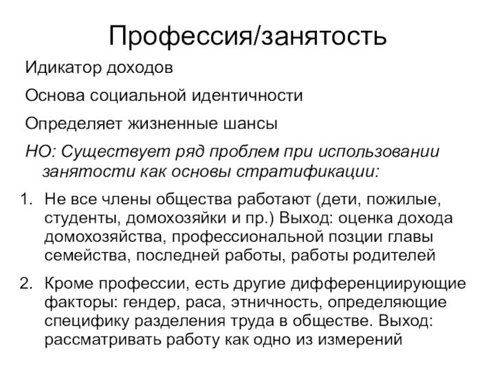 Кроме профессии, есть другие дифференциирующие факторы: гендер, раса, этничность, определяющие специфику разделения труда в обществе. Выход: рассматривать работу как одно из измерений
