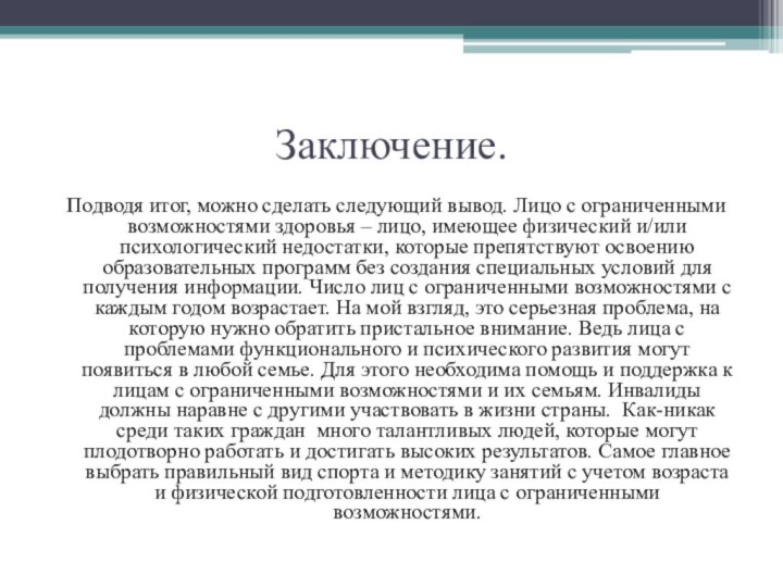 недостатки, которые препятствуют освоению образовательных программ без создания специальных условий для получения информации. Число лиц с ограниченными возможностями с каждым годом возрастает. На мой взгляд, это серьезная проблема, на которую нужно обратить пристальное внимание. Ведь лица с проблемами функционального и психического развития могут появиться в любой семье. Для этого необходима помощь и поддержка к лицам с ограниченными возможностями и их семьям. Инвалиды должны наравне с другими участвовать в жизни страны. Как-никак среди таких граждан много талантливых людей, которые могут плодотворно работать и достигать высоких результатов. Самое главное выбрать правильный вид спорта и методику занятий с учетом возраста и физической подготовленности лица с ограниченными возможностями.