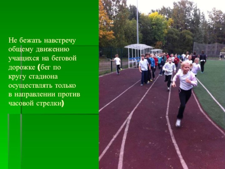 дорожке (бег по кругу стадиона осуществлять только в направлении