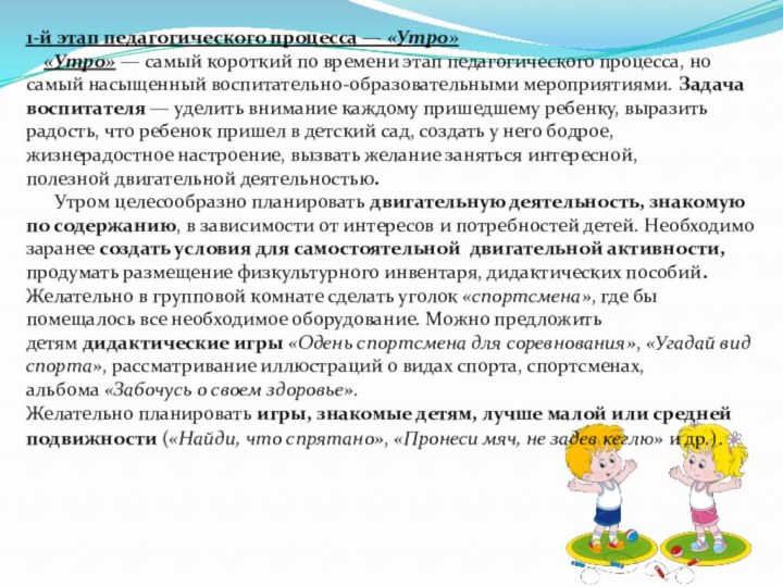 воспитательно-образовательными мероприятиями. Задача воспитателя — уделить внимание каждому пришедшему ребенку, выразить радость, что ребенок пришел в детский сад, создать у него бодрое, жизнерадостное настроение, вызвать желание заняться интересной, полезной двигательной деятельностью.