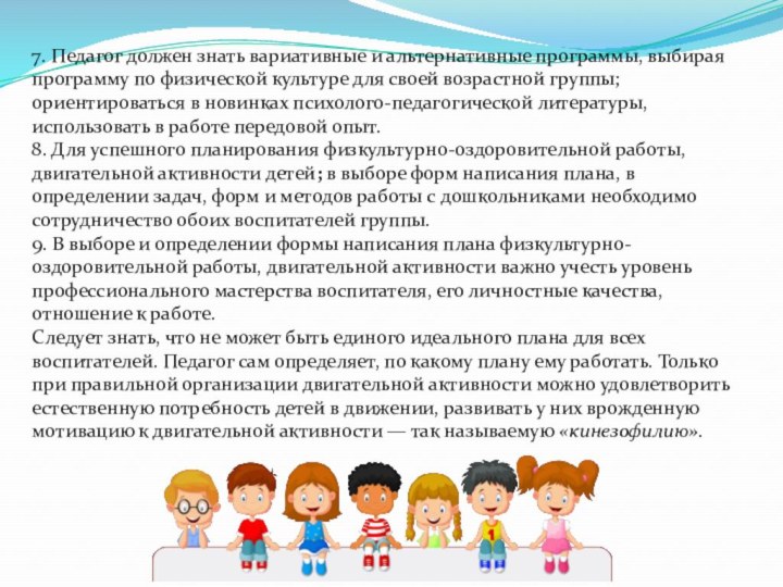8. Для успешного планирования физкультурно-оздоровительной работы, двигательной активности детей; в выборе форм написания плана, в определении задач, форм и методов работы с дошкольниками необходимо сотрудничество обоих воспитателей группы.